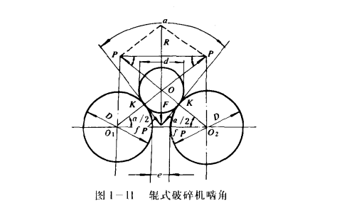 下圖可以看出,從物料與輥?zhàn)拥慕佑|點(diǎn)作切線,兩條切線的夾角為α。設(shè)p為輥?zhàn)幼饔迷谖锪仙系恼龎毫,p·f為輥?zhàn)幼饔糜谖锪仙系哪Σ亮,f為摩擦系數(shù)。